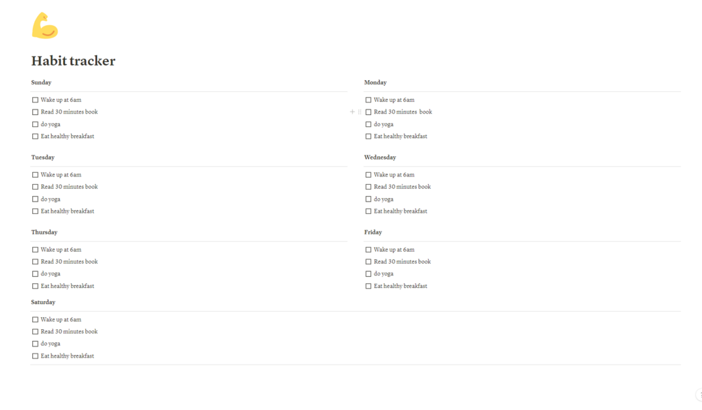 Habit Tracker is a digital product designed to help you keep track of your daily habits and routines. It is a simple yet powerful tool that allows you to easily create and manage a checklist of habits you want to develop or maintain. With this digital product, you can easily set reminders and notifications to help you stay on track, and track your progress over time. Whether you're looking to improve your health, productivity, or overall well-being, Habit Tracker is the perfect tool to help you achieve your goals. With its intuitive and user-friendly interface, you'll be able to stay organized and motivated as you work towards building the habits you want to see in your life. So, it is a notion checklist that helps you to track your habits and routines.